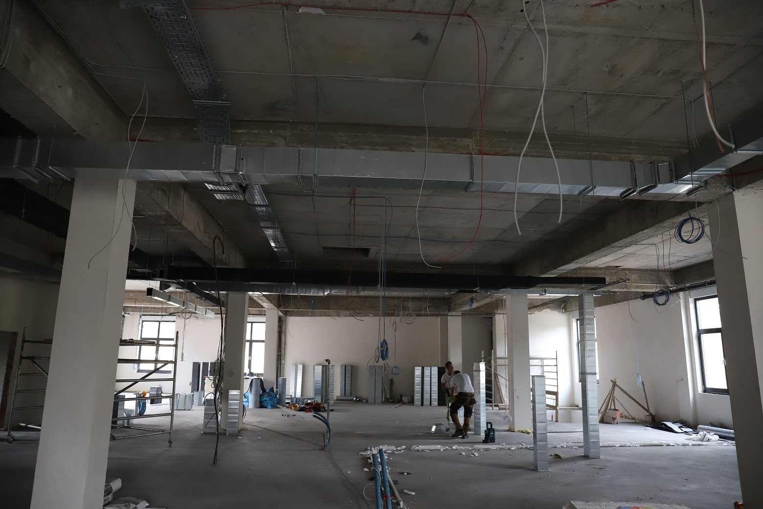 U prizemlju su već postavljeni zidovi od gips-kartonskih ploča i nosiva konstrukcija za spušteni strop, a uskoro slijedi njegovo postavljanje. Na spratu se isti radovi upravo izvode. U sanitarnim čvorovima prizemlja završena je ugradnja zidne keramike, dok je postavljanje podne keramike u toku.