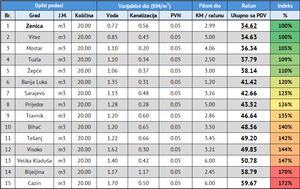 Posebno smo ponosni što kraj 2025. godine dočekujemo kao vodovodno preduzeće koje svojim građanima usluge pruža po najnižoj cijeni u cijeloj državi. Kao ilustraciju ove tvrdnje, u tabeli koja slijedi navodimo iznose računa za nekoliko gradova tj. vodovodnih preduzeća koja se po nekom osnovu mogu porediti sa Zenicom. Izračun je napravljen prema javno dostupnim podacima o cijenama usluga u prikazanim gradovima i pretpostavljene potrošnje 20 m3/mjesečno, što približno odgovara prosječnoj potrošnji četvoročlane porodice, kako slijedi: