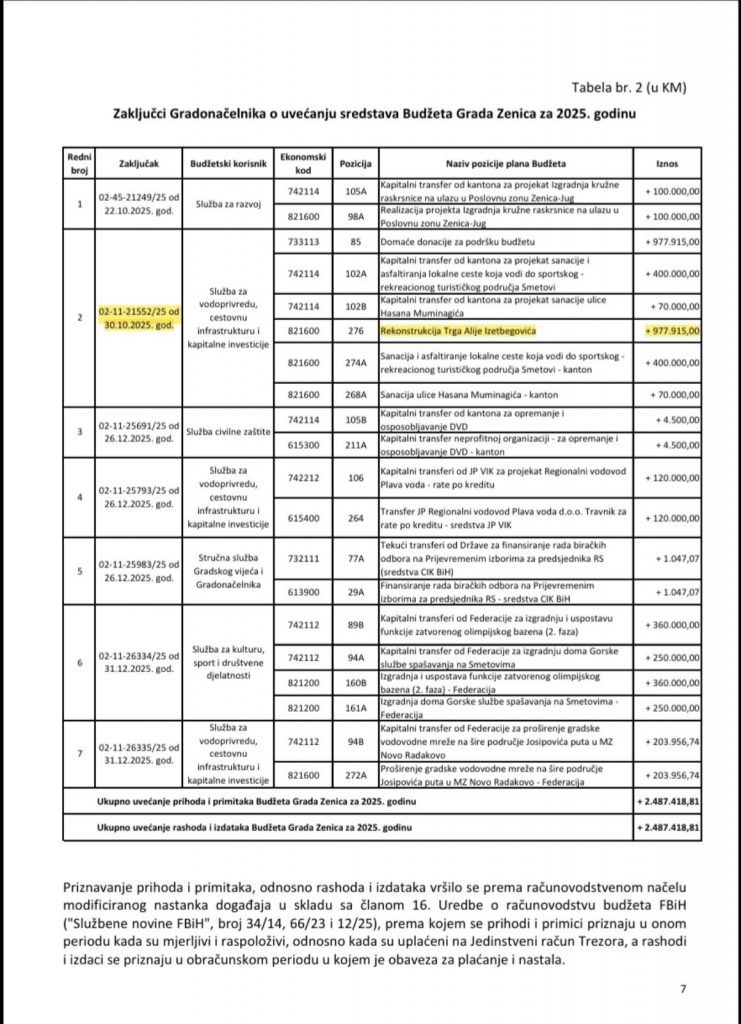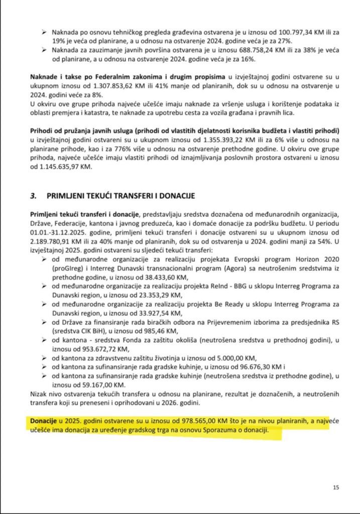 Posebno je važno naglasiti da su tvrdnje o “skrivanju” sredstava potpuno netačne i lako provjerljive. Donacija je uredno prikazana u Izvještaju o izvršenju Budžeta Grada Zenica za 2025. godinu, u dijelu “Domaće donacije za podršku budžetu”, kao i kroz poziciju “Rekonstrukcija Trga Alije Izetbegovića”, što dodatno potvrđuje da nije bilo nikakvog skrivanja niti netransparentnosti.