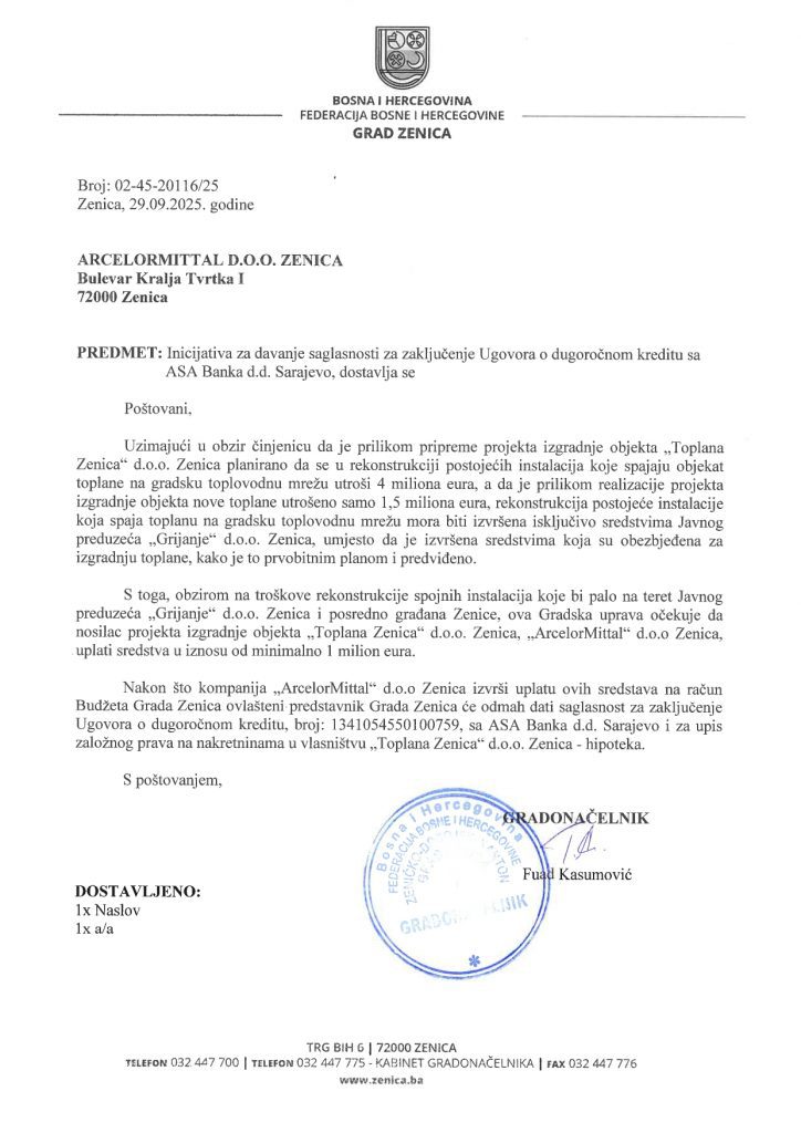 Zbog toga je Grad Zenica tražio da i Zenica, koja je decenijama nosila najveći teret industrijske proizvodnje, zagađenja i posljedica poslovanja kompanije, bude tretirana na korektan i odgovoran način.